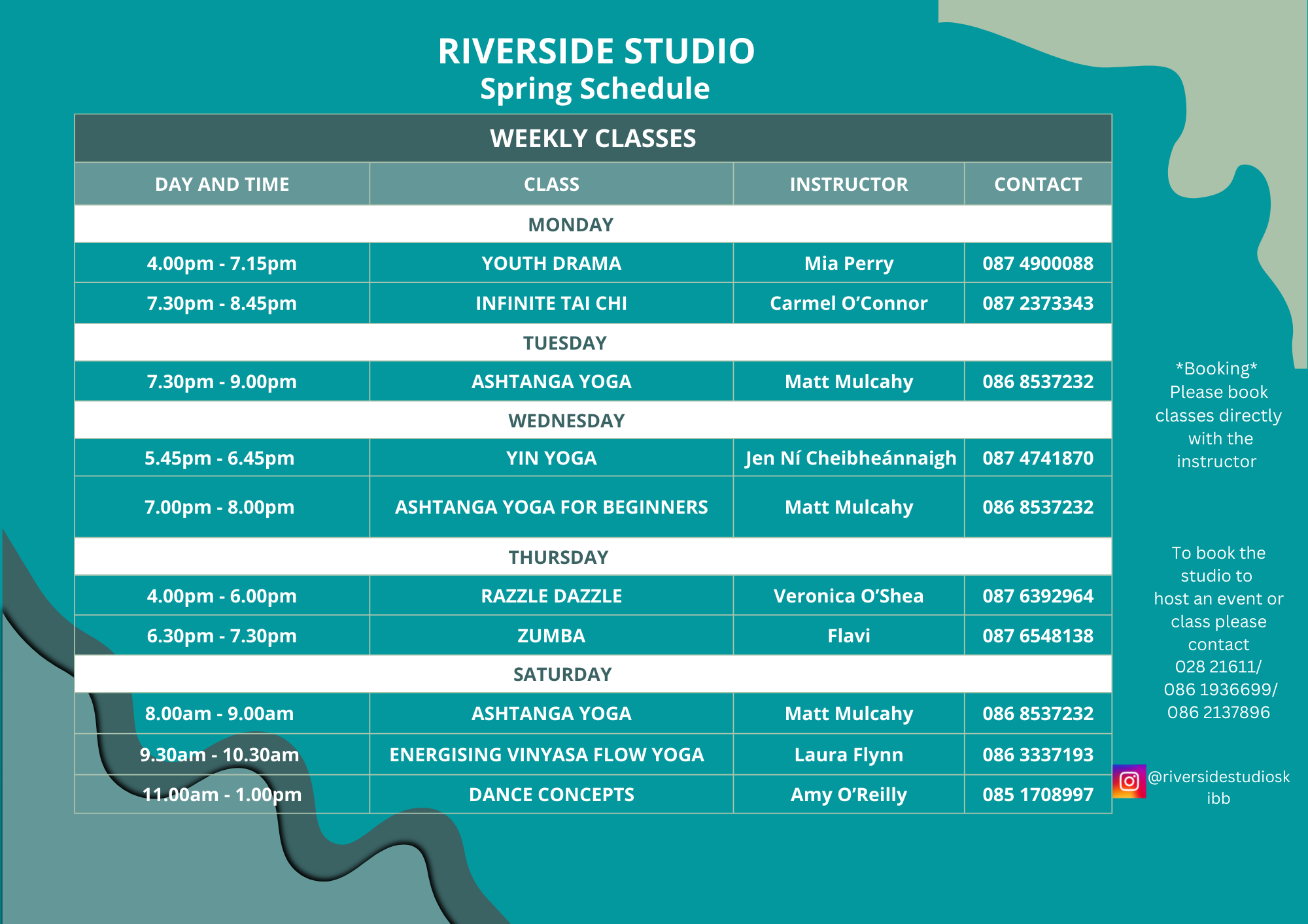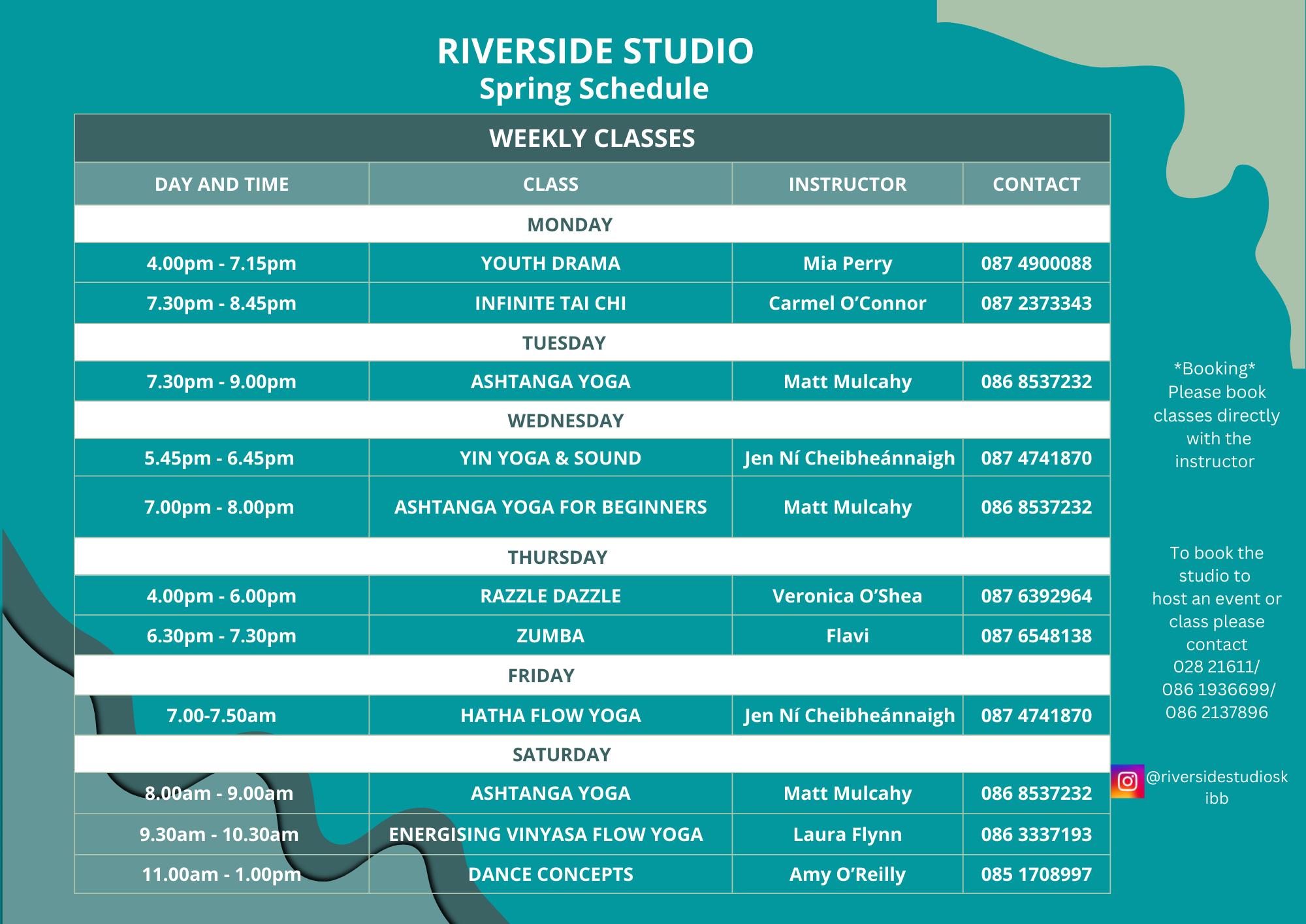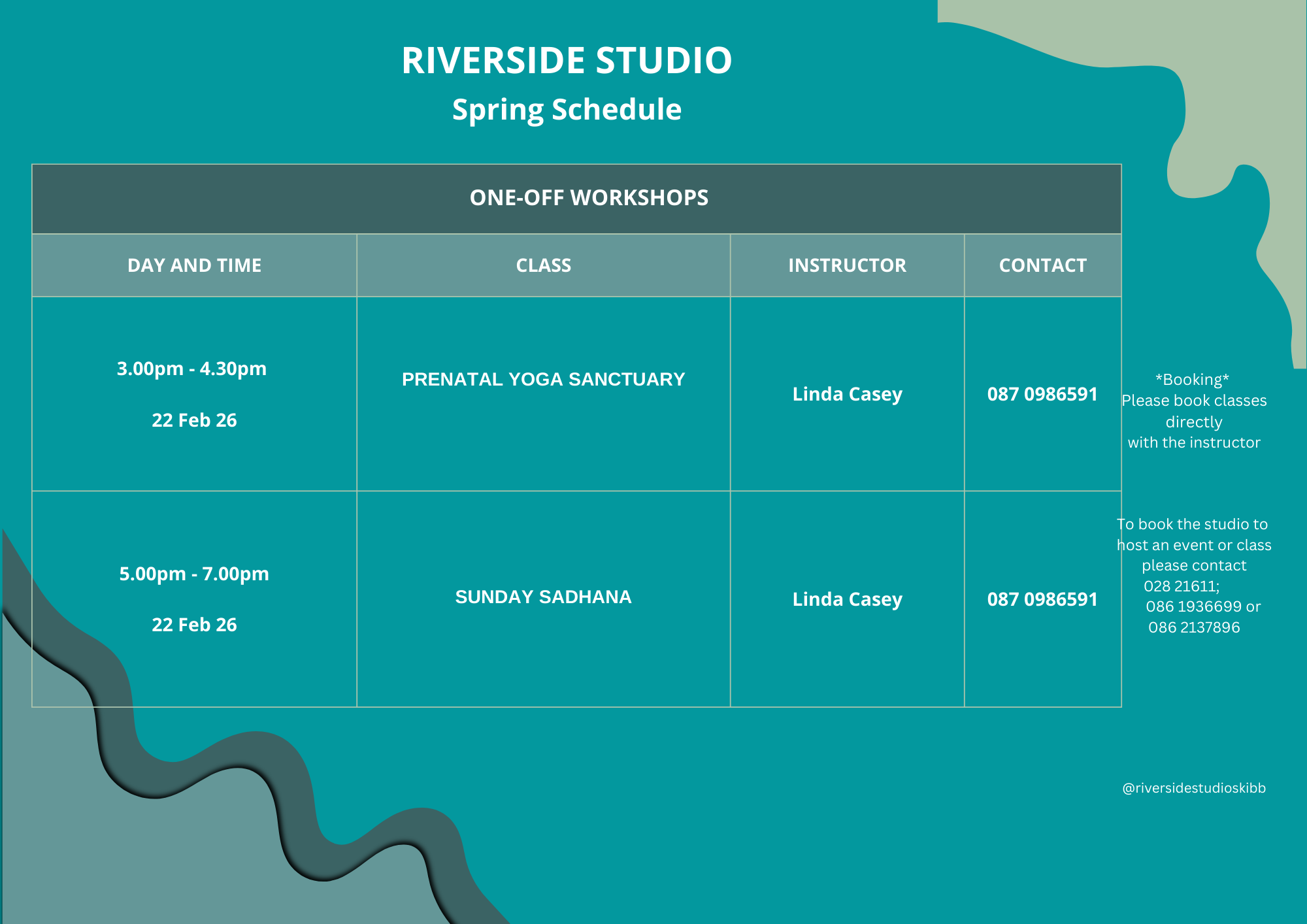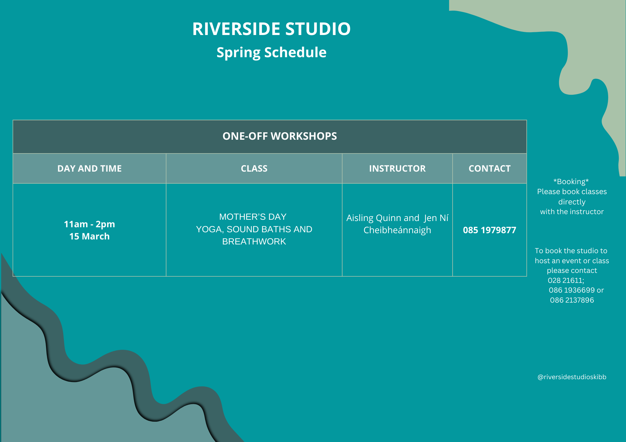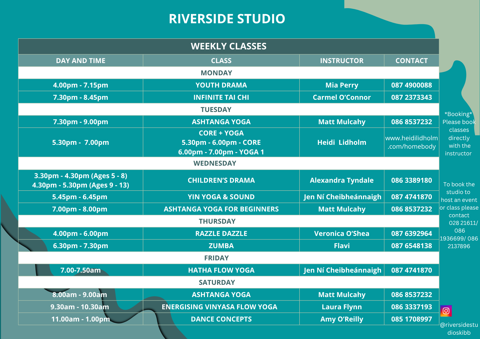 Please keep an eye on Instagram (@riversidestudioskibb) for any upcoming special or once off classes